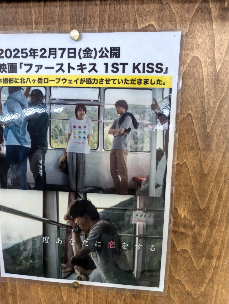 1型糖尿病のお友達と行くスキーツアーですが、2日目ピラタス蓼科を滑る予定でしたが天候が悪く10数人いる仲間の殆どが早々に離脱しました。それでも3人のつわものが1本だけとして滑りに行きました。そこで私はお酒を飲みながらロープウェイ乗り場で待つことにしました。するとそこにファーストキスの舞台があるではありませんか。