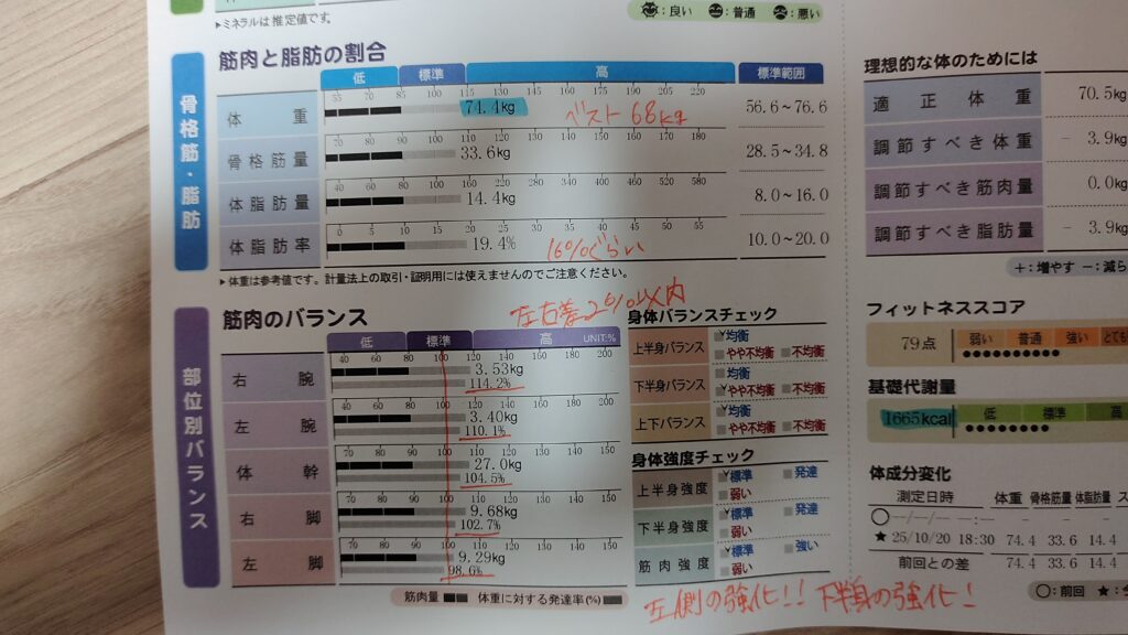 結果によると左右差が大きく、私の場合左を中心に鍛える必要があり、トレーニングの中心を下半身にするようメニューを組むことになるそうです。左足を一番鍛えるということです。それ以外は大きな問題はないのですし、脂肪量も良い感じなのですが、内臓脂肪量が過多でした。